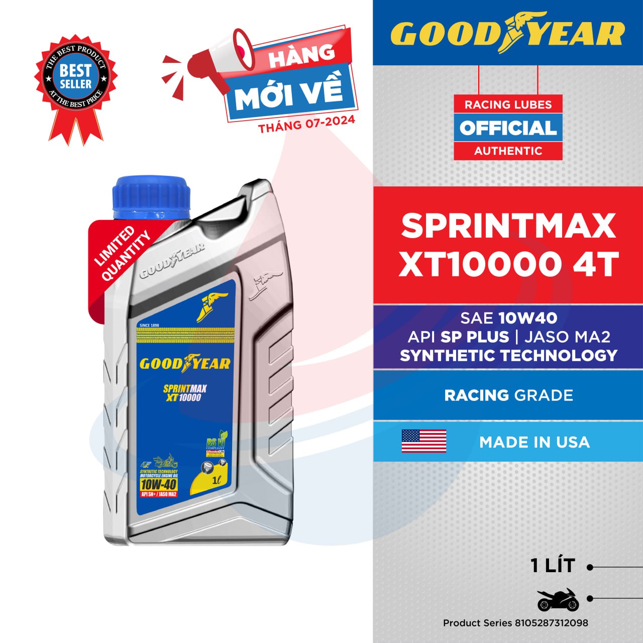 Goodyear SPRINTMAX XT10000 4T 10W40 là dầu động cơ cấp cao được pha trộn giữa dầu gốc tổng hợp chất lượng cao và các chất phụ gia đặc biệt, cung cấp khả năng bảo vệ động cơ, hộp số và ly hợp ướt được sử dụng trong các xe máy thế hệ mới. Ứng dụng cho các động cơ có công suất và mô-men xoắn cao, phù hợp với nhiều loại nhiệt độ môi trường. Dầu này được sản xuất cho những người đam mê xe máy tốc độ cao đang mong đợi trải nghiệm lái xe thú vị hơn.