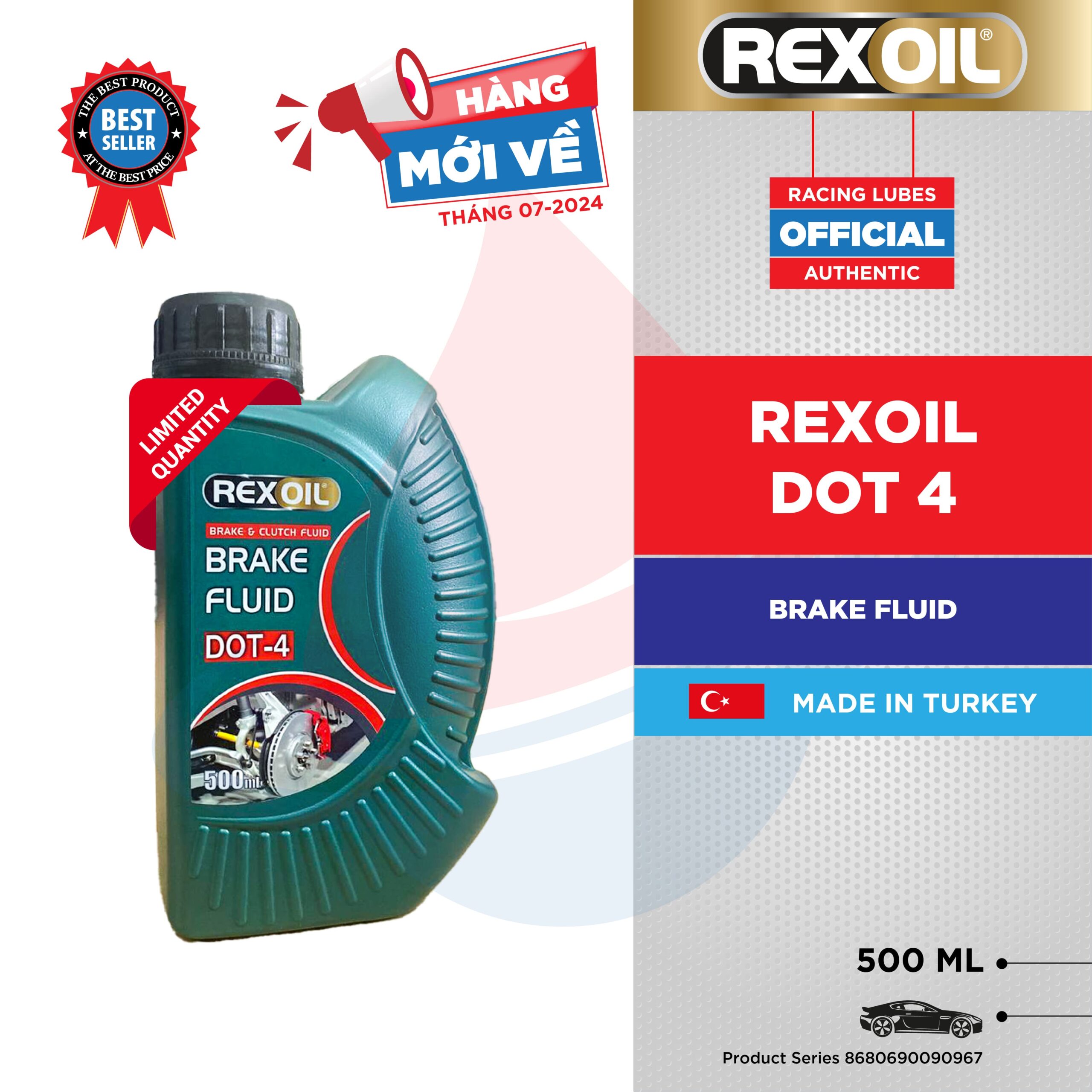 REXOIL Brake Fluid DOT-4 được phát triển dựa trên công nghệ polyethylene glycol ether để cung cấp hiệu suất cao nhất cho hệ thống phanh và côn. Nó có điểm sôi tối thiểu là 250°C và được thiết kế để sử dụng trong cả hệ thống phanh đĩa và phanh trống, hệ thống côn, và các hệ thống thủy lực khác mà chất lỏng DOT 4, DOT 3 và SAE J1703 được khuyến nghị. Sản phẩm cho thấy hiệu suất cao ngay cả trong các điều kiện nhiệt độ cực đoan do ma sát của hệ thống phanh.